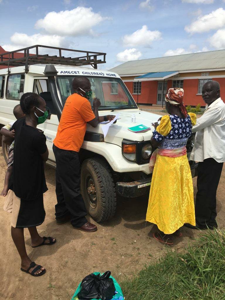 Today it was a big day in Amecet!!! We said goodbye to three children!! Simon, Robinah (one of our nurses) and me travelled to the village to bring three children back to their relatives. Because of Covid 19, there is still no public transport and also the motor taxis are not allowed to operate. Last week, Simon went to the three families to check on them, some of them we can't even reach by mobile phone. We always try to get a mobile number, sometimes a neighbour or relative, but this time we had not all the contacts, so Simon went to visit the, last week. They were all ready to receive them back and we were going to do that today. Simon had asked them to come to certain places near their home, because the time he visited them, the whole neighbourhood gathered, we didn't want that, because gatherings are still not allowed. So we left at 8.30 am, with the face masks, on our way to the village.