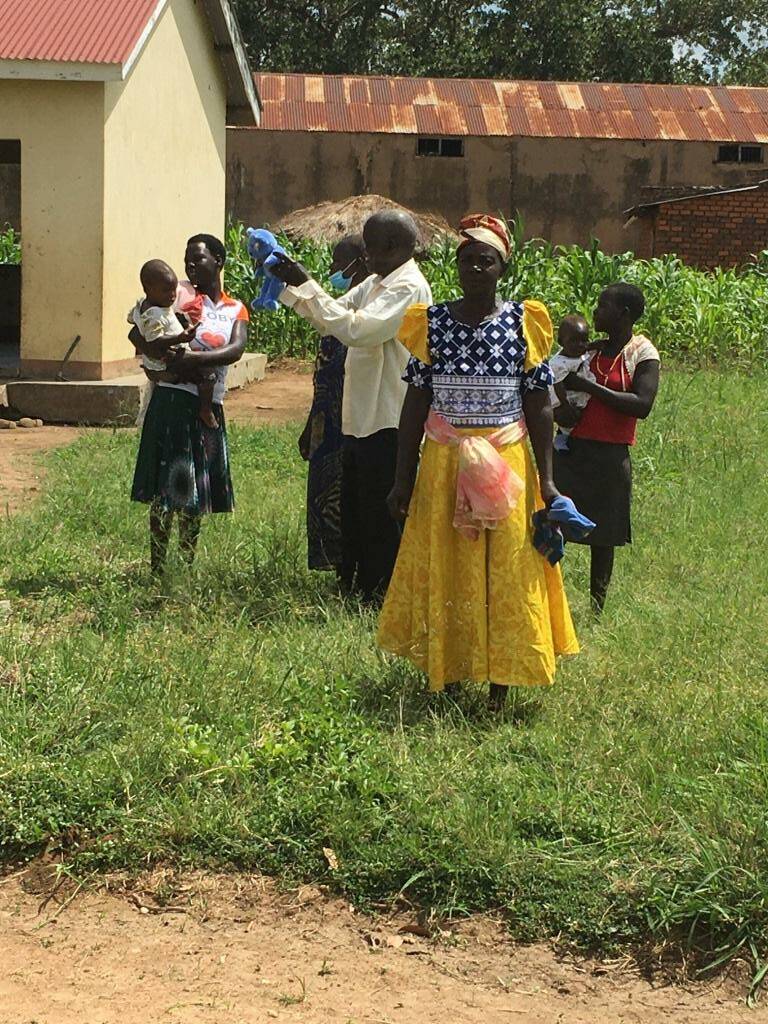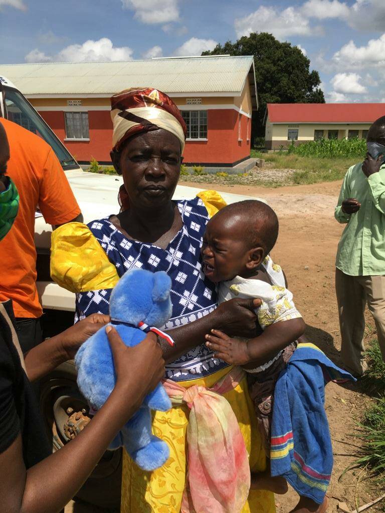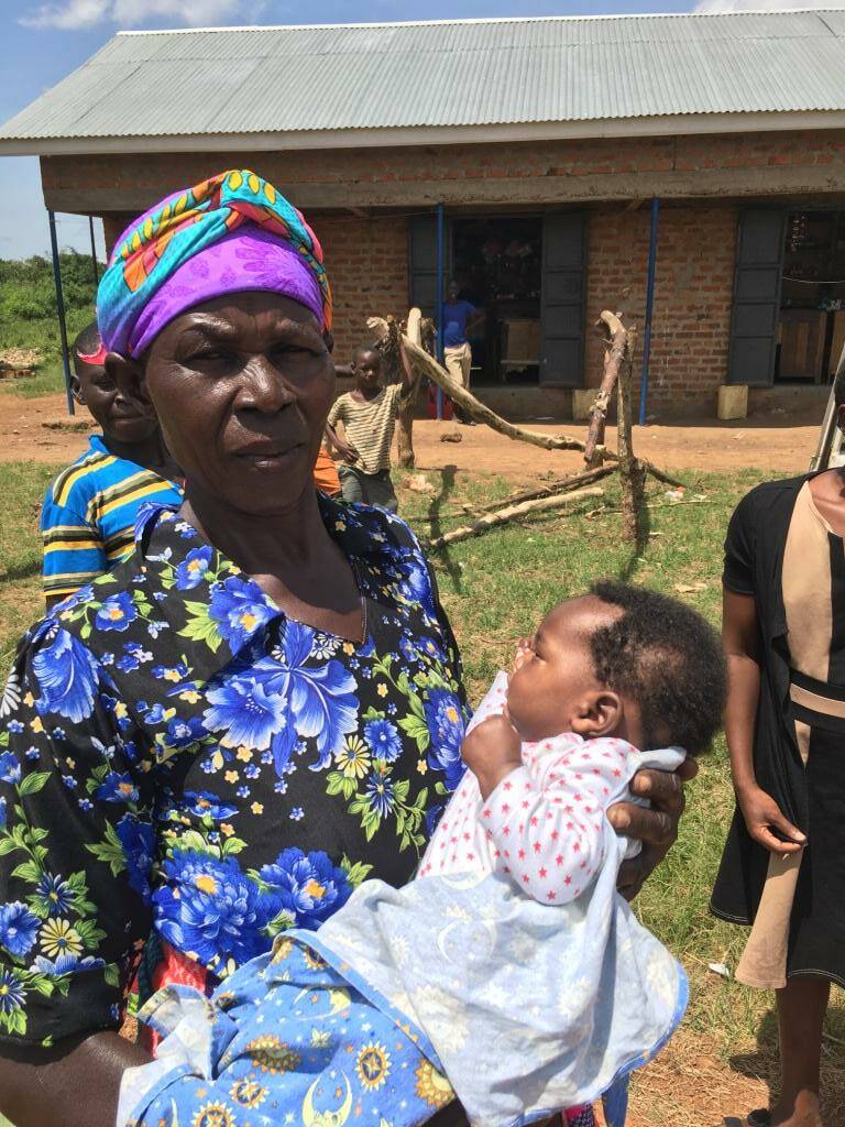 We agreed to meet the grandmother at the nearby health centre, her neighbour came with her, to help. The grandmother can't read and we had to explain the medicines to her. Daniel needs his medicines every day, at 7 am and at 7 pm. So after I explained them, Simon let her do it, to see if she understood. The neighbour was there too and he will keep an eye on it as well. She did well, then we handed Daniel to her and he cried.... When a child is older, it is more difficult for them, as they are used to us so much. There was another lady who took him and the neighbour played with him with one of the toys we gave him. Every child who is resettled gets a package with some clothes, toy, mosquito net, some food and a drinking cup. When we drove away, Daniel was quiet, but he was looking at us and following us with his eyes. We are a bit worried about him, his place is at home, with his his grandmother, but the medicines are a challenge!! We will go back to check on him and he has to come to Soroti for new medicines and a blood test in August.
