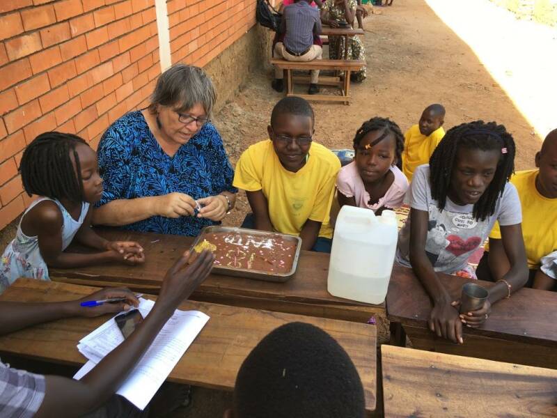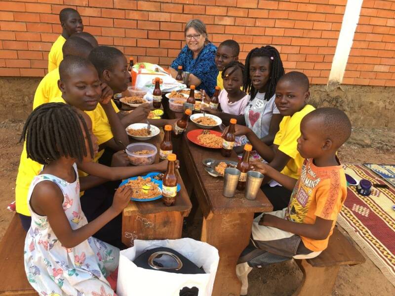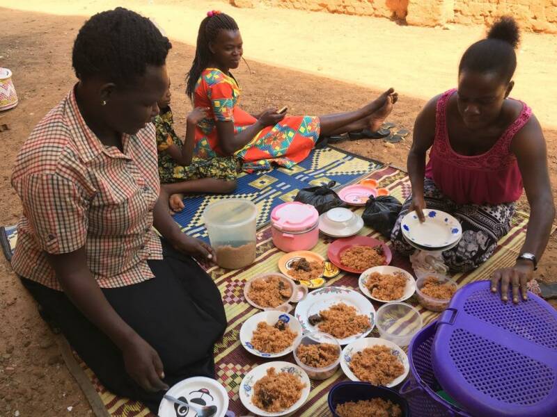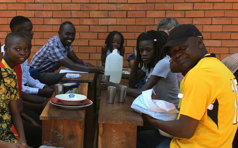 Josephine and Mary preparing the food and everybody enjoys the meal! We also had a birthday to celebrate, Faith, (the daughter of Simon and Josephine) became 18 years old the day before. So there was even a cake!!