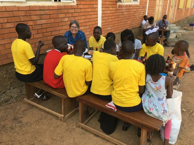 As Amecet, we not work only with baby's. We still follow a group of vulnerable children (HIV/AIDS and Orphans) even when they go to secondary school. They all have been living in Amecet when they were young and Amecet has helped them through the primary school, when they were living with their relatives and even in secondary school. There is a group of 5 girls in a secondary school in Soroti, they are in boarding and yesterday was the visitation day. There is one visitation day per term (3 months). So families come to school and everywhere people sit in little groups and eat together. Simon's son and daughter are also in the same school, so we were in a big group!