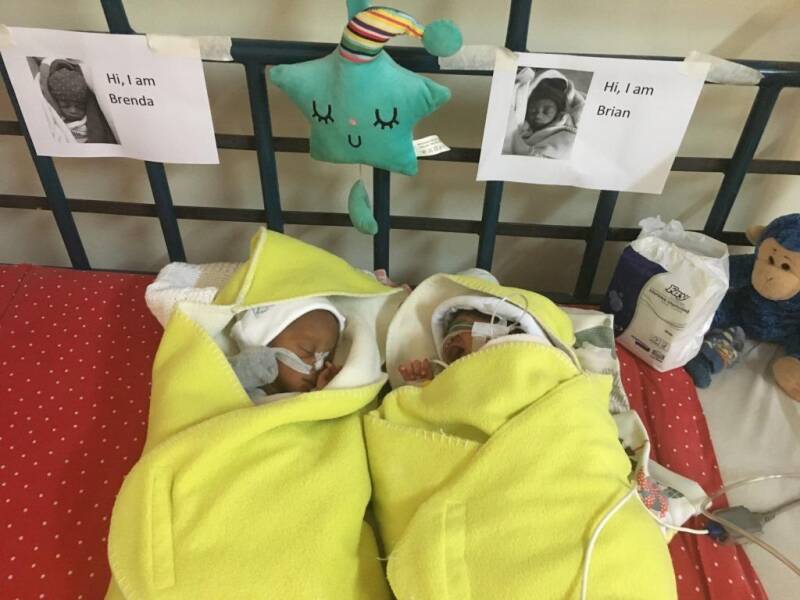 We got a phone call, on 7/8 about twins from a health centre in the village.. Simon went there the next morning, the mother of the twins had given birth at the side of the road. Nobody knows the mother, she was alone and she is mentally retarded. Someone helped her and brought her to the health centre, but she refused to breastfeed and than we were called. The baby's are very small, their weight is 1.7 kg and 1.4 kg. We brought them to the Doctor and they were put on IV antibiotics. The second day, Brian got breathing problems, because they are premature born, their lungs were not ready yet for the world, so he is put on special medicines and on the oxygen. We feed both baby's every two hours via the NG tube. Today they are 5 days old, we do all we can, they are in a special warm room and we pray they both make it.... Every day is one day of more feeding and strength!! We have pictures of the mother, and we have several stories of her, we want to know where she is from, so we can contact her relatives, she is not able to care for the baby's, It is another tragedy.....