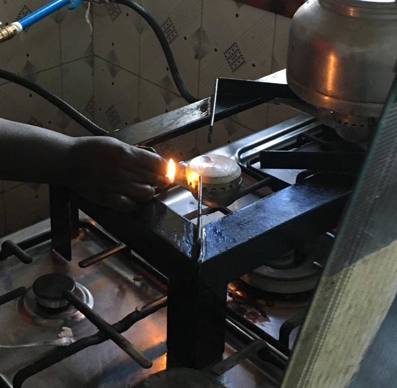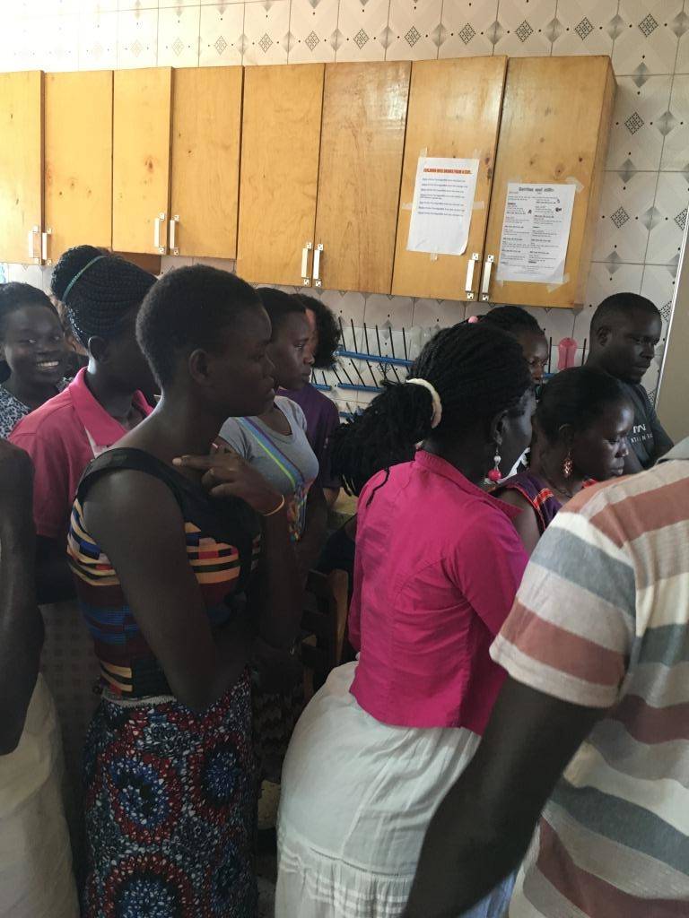 The first picture showed the man, explaining how to light it and how to regulate the gas flow, he let several staff light the fire and then Elias gave a small lesson how to keep it all safe and tidy. You see most of the staff listening and we hope that it will serve Amecet well. In the outside kitchen, where the cook is preparing in the big pots, we also have Bio gas now. The cook prepares there the Posho, the beans and the rice in the big cooking pots, while the inside stove is mainly used for boiling water, porridge and at night, the staff who is on night duty uses the inside stove.