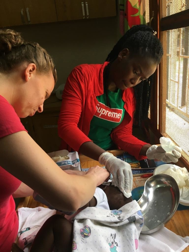 We took him directly to the doctor and he was put on IV, medication. Our nurses are cleaning his head twice a day. On the picture left you see Clare, our Ugandan nurse and Anjo our Dutch nurse working on him.