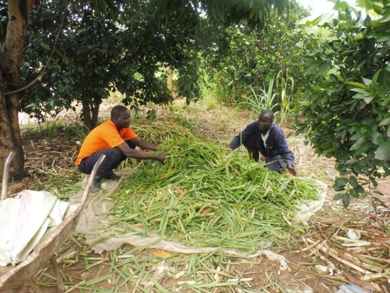 On a part of the land, we planted Elephant grass, the cows love it and when you cut, it grows again. We have build a storage place where we can keep the grass for the dry season. On the first picture, you see the pipes, that is connected with our solar water pump, it's irrigates the water over the soil, even in the dry season. The cows love the grass, as you can see on the third picture. It is cut by the two men who are working at the farm. And this results in the cow manure, which is brought to Amecet, to feed the biogas, where Amecet does the cooking with!!!