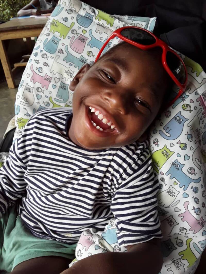 Ali was brought by the Police in June. Very malnourished and big wounds (decubitus) and very hard to handle, he is spastic and can't sit or talk. He is around 5 years, we think. His family was found, but not much willing to help him. we started by treating his wounds, trying to feed him and hold him. He can be very angry and then he bites and slaps you. But things changed..... he started to eat better and his wounds were healing (by honey). He laughs and we took him to physio therapy, he hardly uses the right side of his body. Look at the picture right.... He enjoys music, certain toys, being talked to and played with!!