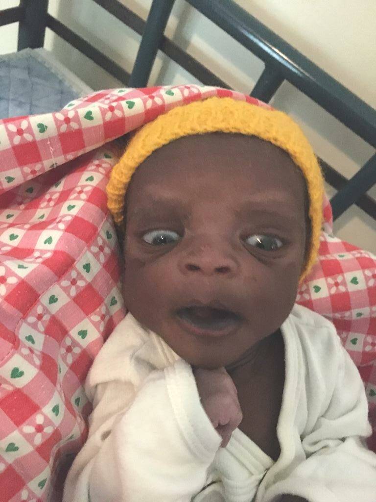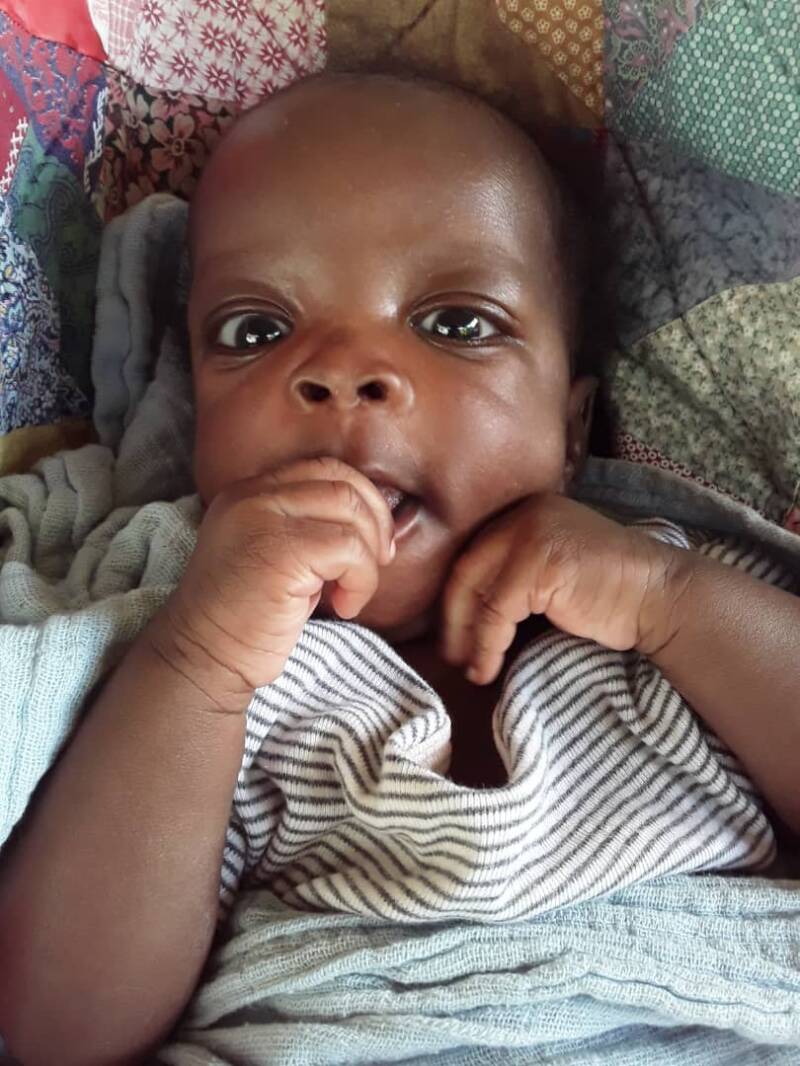 Samuel was brought to Amecet by his mother (June). Because of Covid, we were at first careful to take him in and gave the mother milk money for feeding, but the following week, when she came back, it was not good with Samuel. He was 6 weeks old (left picture) and his weight was 2.1 kg, while according to his papers, his birth weight was 3.4 kg. We took him in and he did well, look at his picture at the right, last week his mother picked him up, he is back home and we help with milk money and porridge flour.