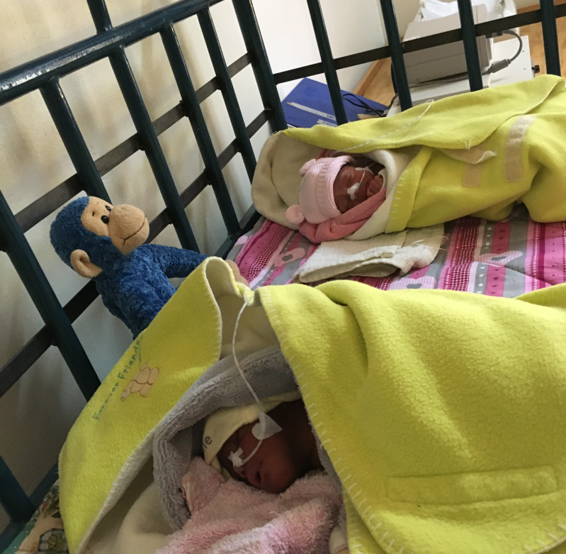 This is Deborah (at the back) and her twin brother William (front). Last week Thursday, we got a call from the hospital in neighbouring district, that a mother has passed away, leaving 2 baby's behind...... The mother was only 7 months pregnant, but she had developed pre -eclampsia and the Doctors had preformed a Caesarian operation, trying to save the mother and the 2 baby's. Unfortunately, the mother passed away. The family asked us if we could take the two mini baby's to Amecet. Honestly, when I saw them, I had to swallow, they were so small..... The little girl's weight was 950 gram and the boy weighed 1200 gram. We have had small baby's under 1 kg. in Amecet, but they didn't make it. What to do??? They would for sure die at home, those baby's need a lot of care, warmth, hygiene and feeding..... often they develop complications, because they were not ready to be born.... Earlier that morning I had read in a devotion that we get sometimes chances offered, it is to us what we do with them...... We don't have to do it alone..... So we took them in the car, back to Amecet. We took them directly to the doctor and we had to give them several days IV medication. We gave them both a NG tube and we set up a feeding schedule, with taking temperature, writing down urine and stool etc. At first we fed them only 5 ml. every 2 hours. They couldn't handle more... William didn't poop, so we prayed for poop and he did after 4 days. Now they are both regular with urine and poop. They are now 8 days with us and they have gained!!!!!! Deborah was 950 gram, now she is 1105 gram and William was 1200 gram and today he is 1370 gram. We are very happy with this, but we realize that they are not yet out of the danger zone. They are laying in a separate room, which we keep as warm as possible. we have assigned one staff to attend to them and we pray that they will pull through, please join us in praying for those two precious children.....