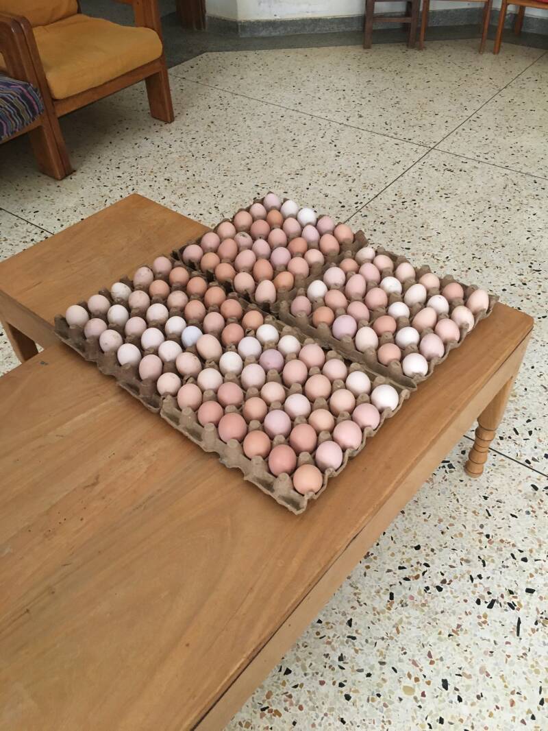 Here you see the first 4 trays of eggs from our own chickens, it started slow, but now every day we get some eggs! No more buying eggs for us now!!