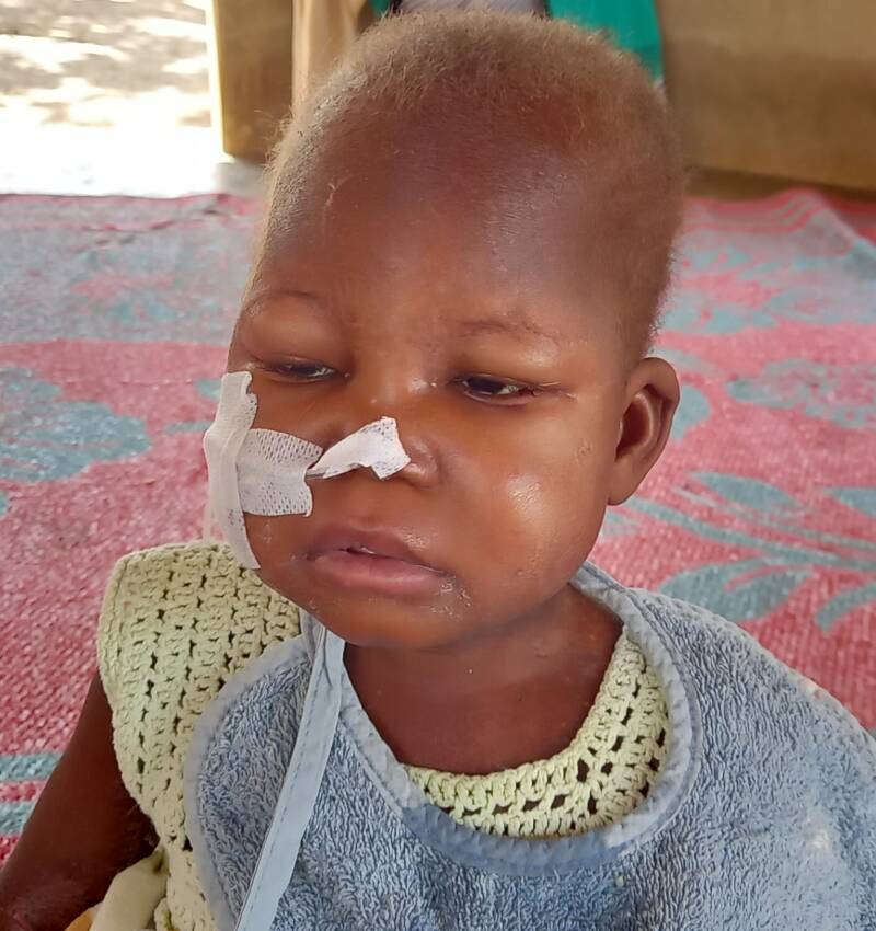 When she was brought, she could hardly see, one eye was completely closed, because of the oedema, the other eye could only open a little bit. Hellen is very unhappy, she doesn't want to eat and drink much, so to help her, we gave her a NG tube, so we can give her special milk through the tube, when she doesn't want to drink. She has pulled the tube out many times already, but we have to put it back again..